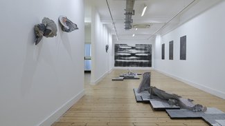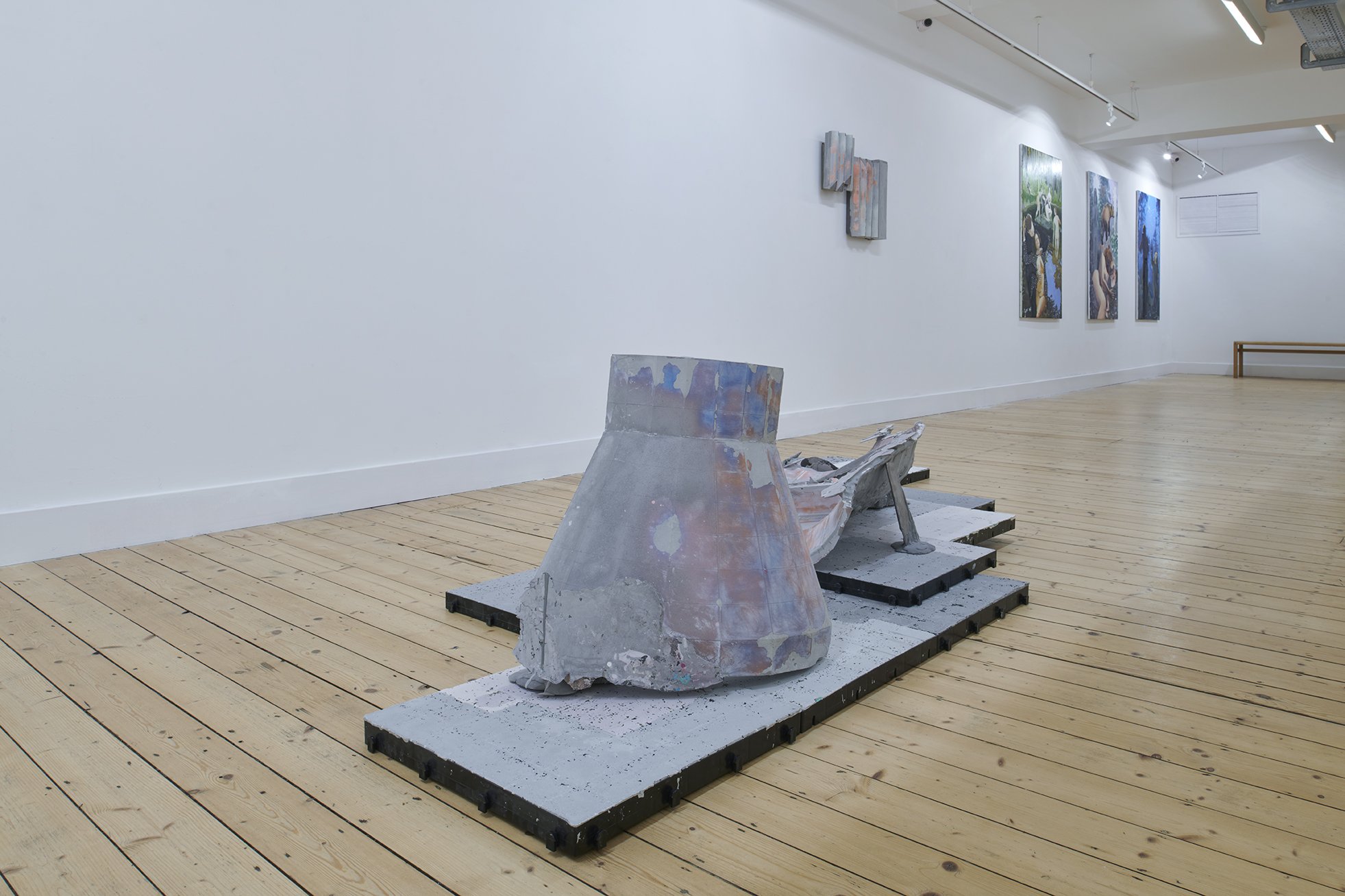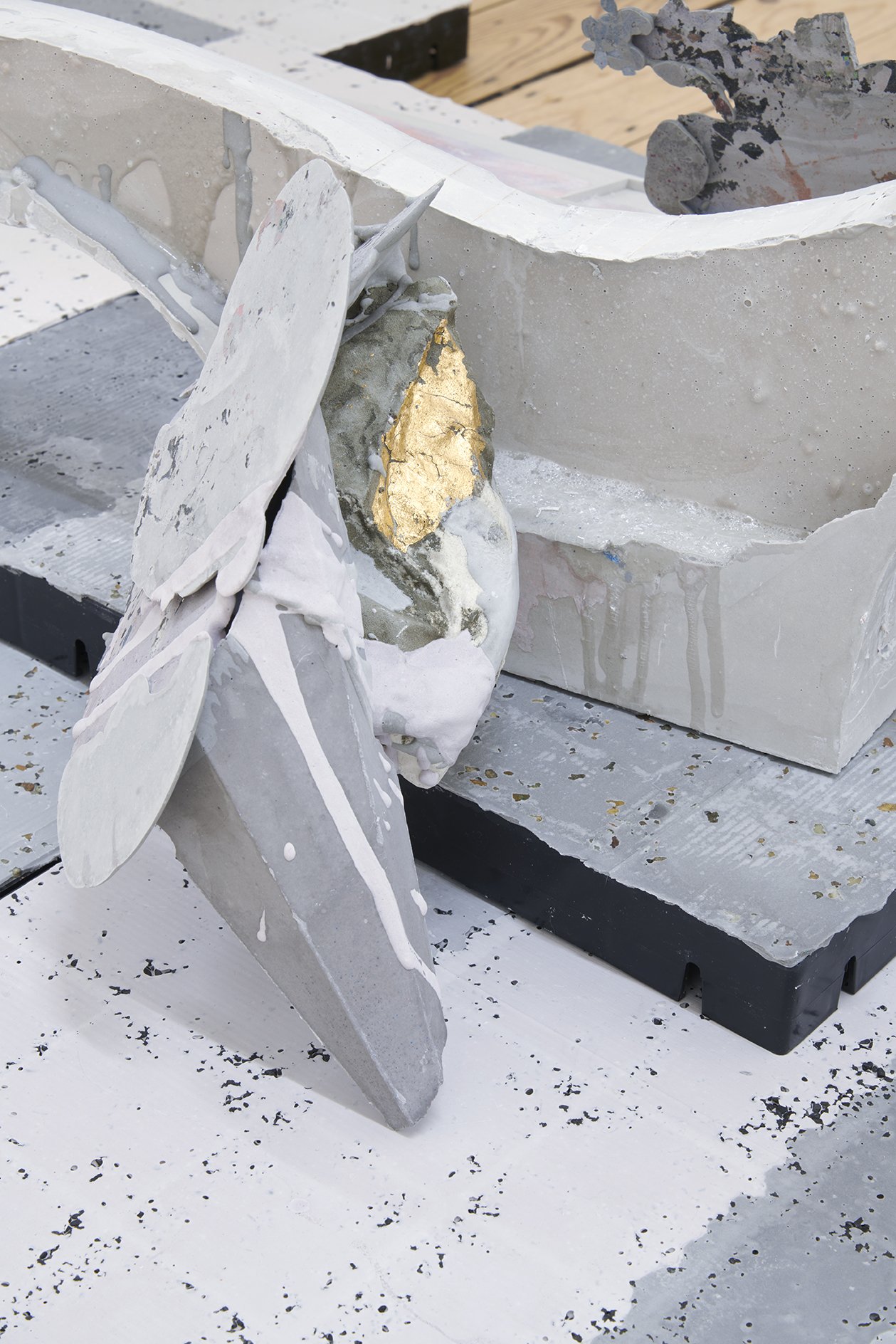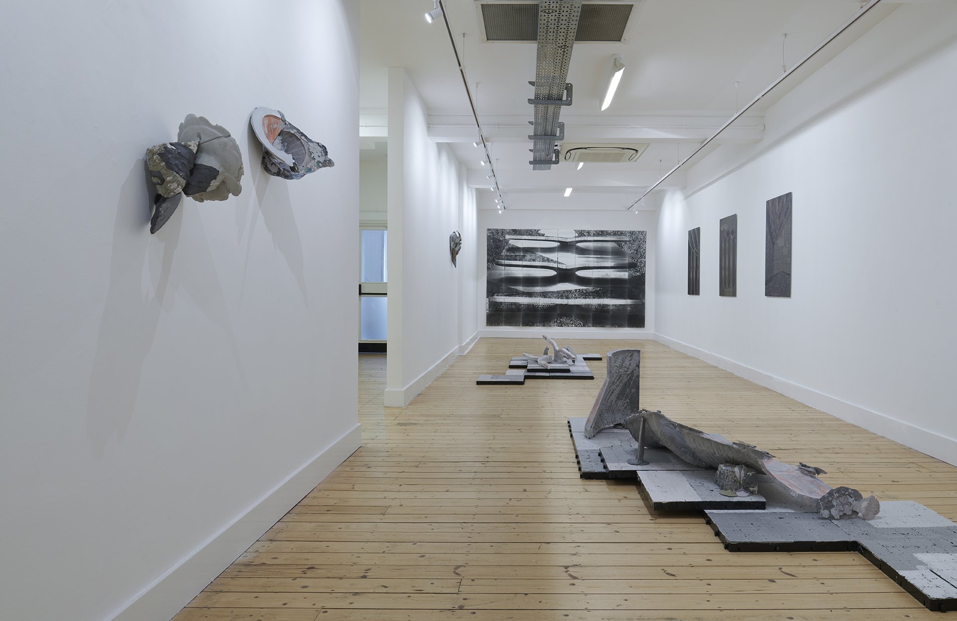 The sculptural wall and floor pieces play with a similar tension between flat surface texture and three-dimensional structure. Using Jesmonite plaster, cement, flint, gravel, plastic and paint, the forms oscillate between areas which are clearly defined and designed three-dimensionally, to areas of solidified movement and spillage, making apparent, the process of change.