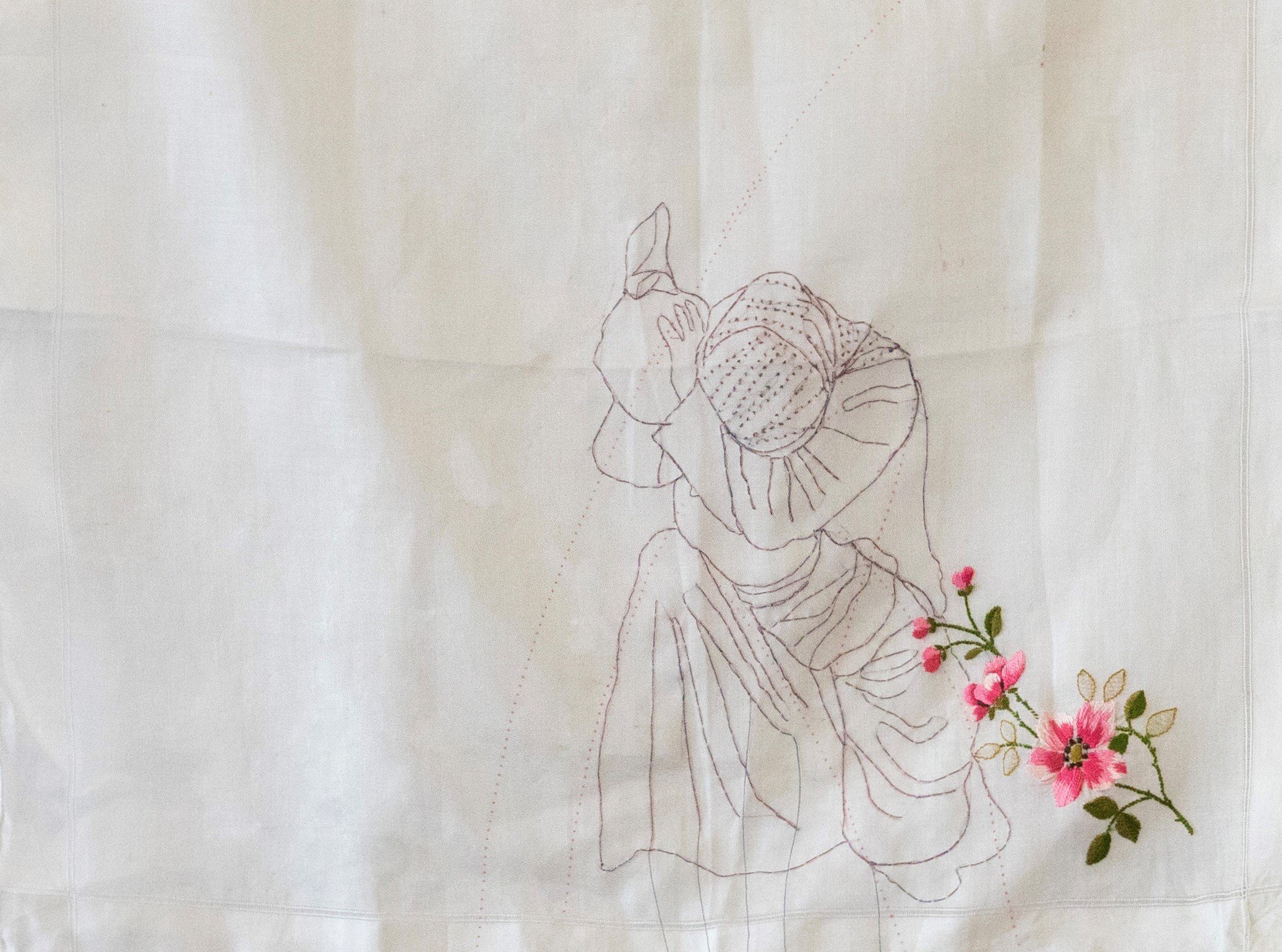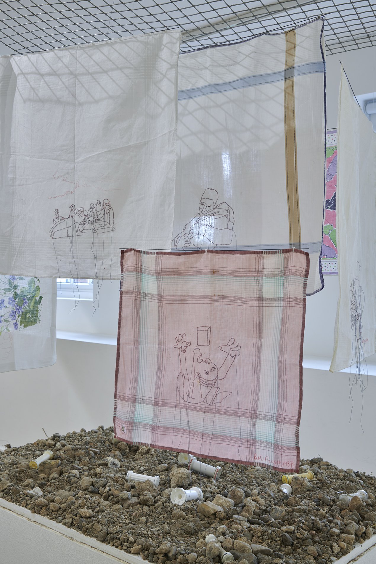 All four artists present large-scale new works in this exhibition: Hailstones, Bars and Meshes is a sound installation with photographic prints by Beverley Carruthers, exploring contemporary oral histories of labour, migration, and community storytelling. Out Of Our Earth is a three-channel film and sound installation by Bettina Furnée that explores ‘leaving’- a friend, a home, a country, our planet- by blending tales of migration and farewell with recorded interviews and elements of science fiction. Permission to Return Granted by Olga Jürgenson explores the impact of forced collectivisation, Stalin’s terror and World War II on the migrant Estonian community, including her family, in the Ulyanovsk area of Soviet Russia during the period between 1929 and 1953. Trigger Warning by Idit Elia Nathan is a sculptural installation of handkerchiefs passed down through the maternal line, delicately embroidered with press images from the war in Gaza and artistic responses to historic horrors of war.