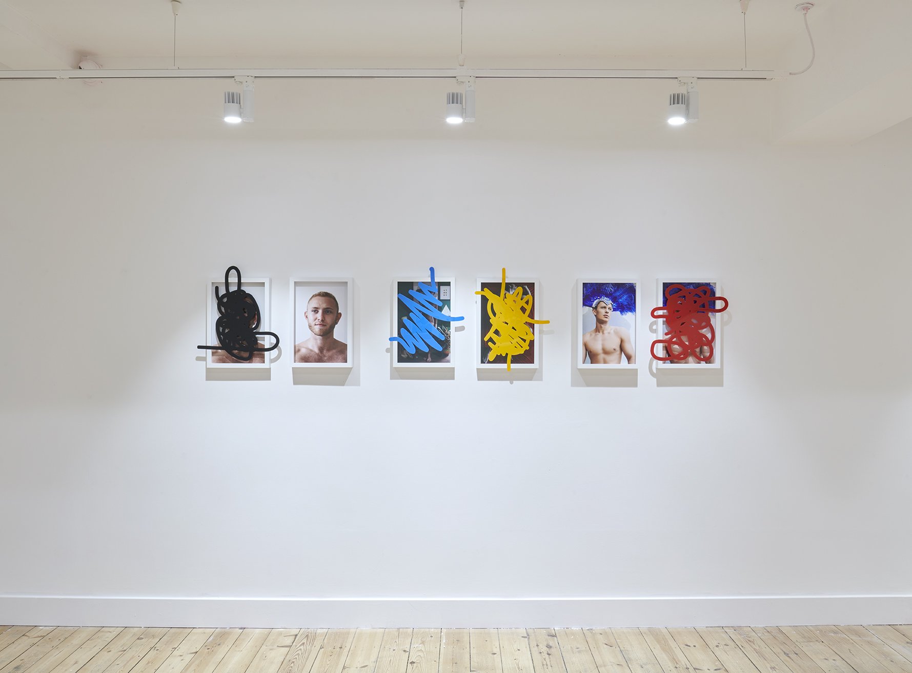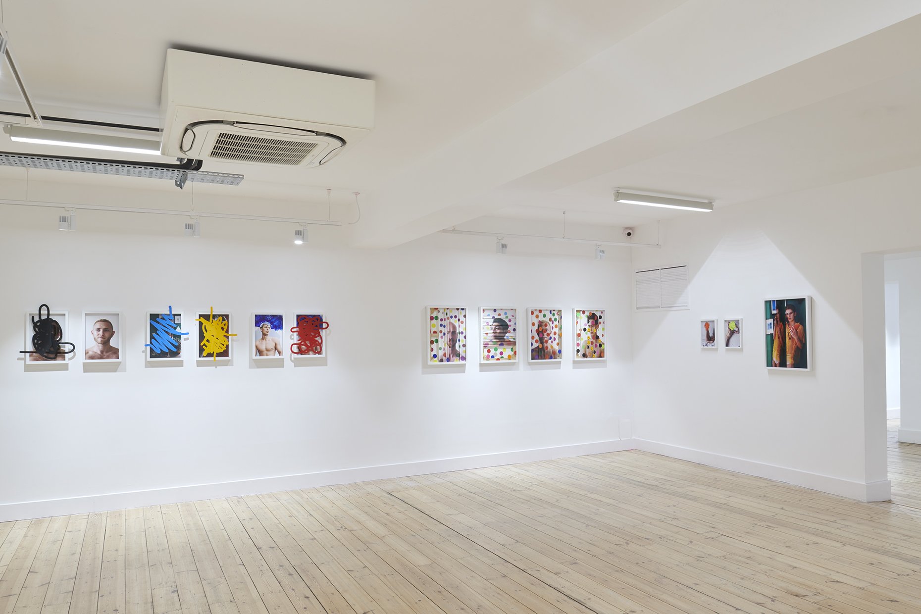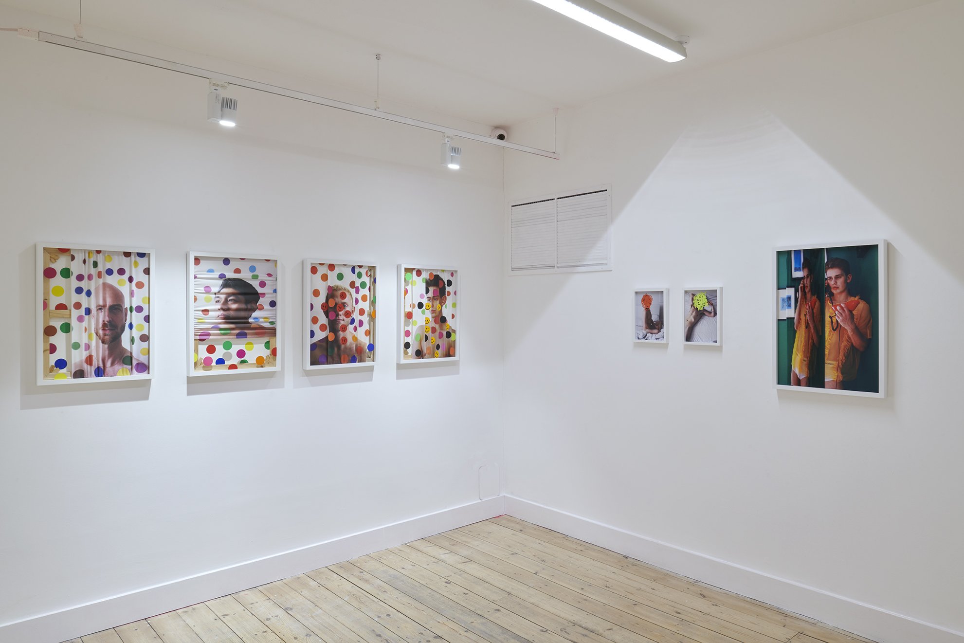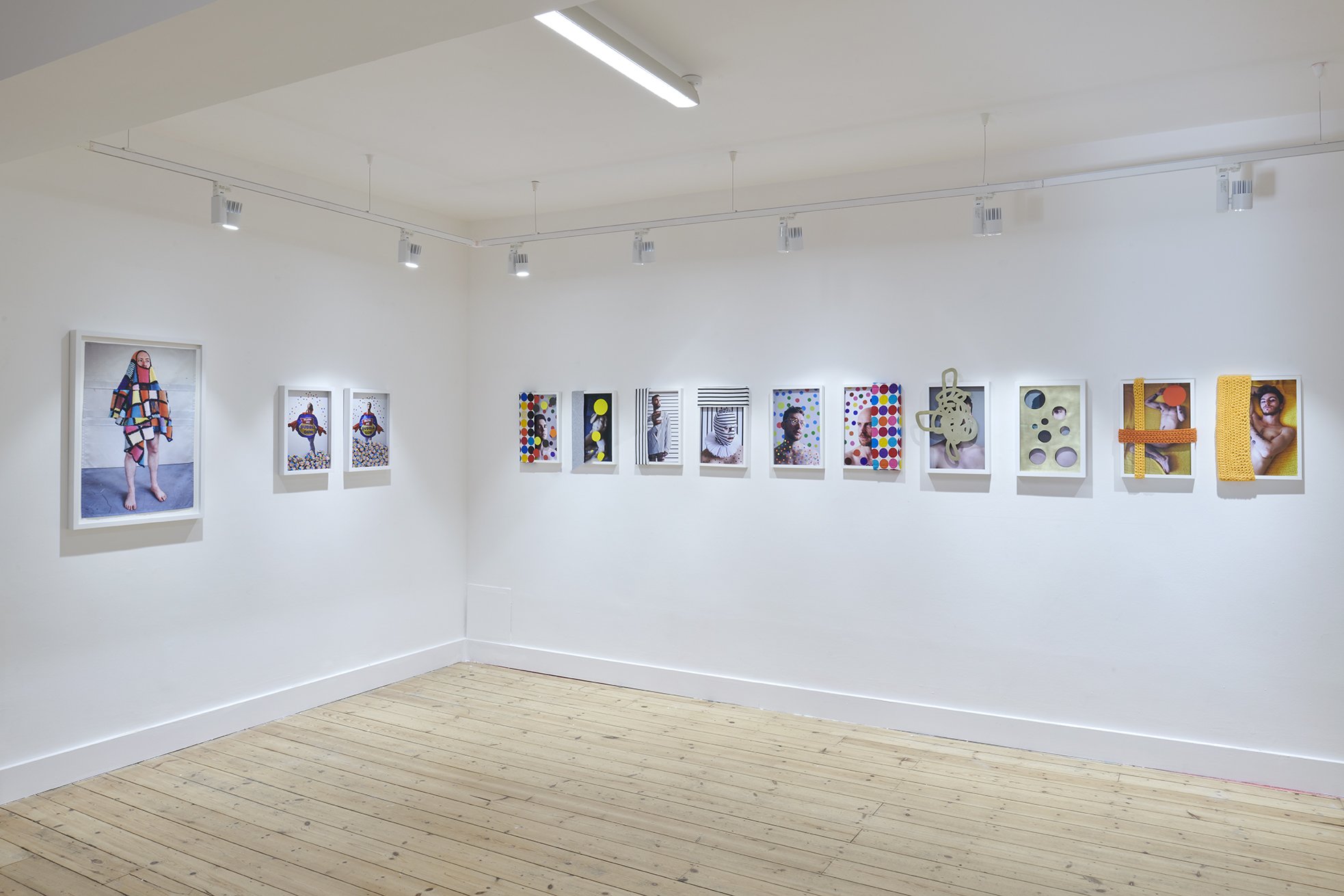 Nigel has been investigating queer self-representation within social media, specifically within dating apps and Instagram. Through obscuring the model’s face, he sets out to critique photographic history and traditional practices. Nigel wraps photographs in found fabrics, overlays stickers, sweets and sculptural elements, that echo in solid form the virtual patterns and emojis that are found in mobile apps. Each seeking to emphasise how manipulated seemingly natural portrait are and how fleeting photographs have become.